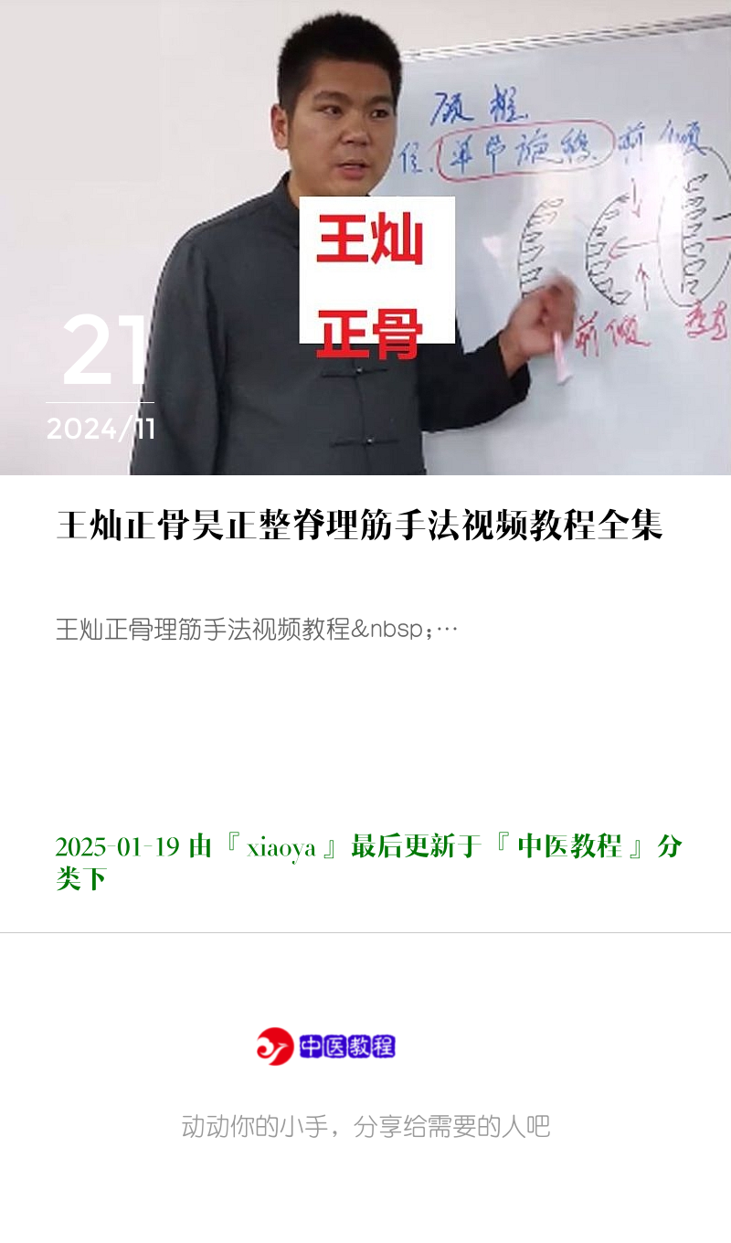 中医教程下载网 中医教程 王灿正骨昊正整脊理筋手法视频教程全集 https://www.zyjcxzw.com/482/